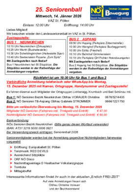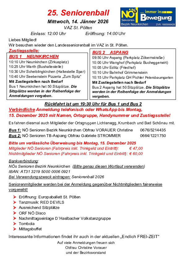 Da wir mit den NÖs Senioren Bezirk Neunkirchen mitfahren, steigen wir am Mittwoch, den 14. Jänner 2026 um 10.05 Uhr in Edlitz beim Friedhof zu - Parkplatzmöglichkeiten sind gegenüber vom Friedhof.