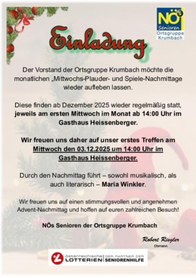 Wir freuen uns euch mitteilen zu dürfen, dass ab 3. Dezember 2025 wieder jeden ersten Mittwoch im Monat unsere "Plauderstündchen" stattfinden.